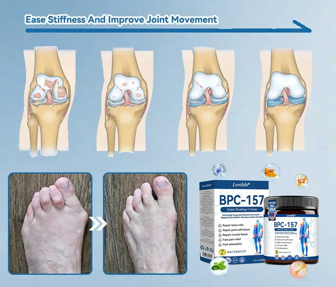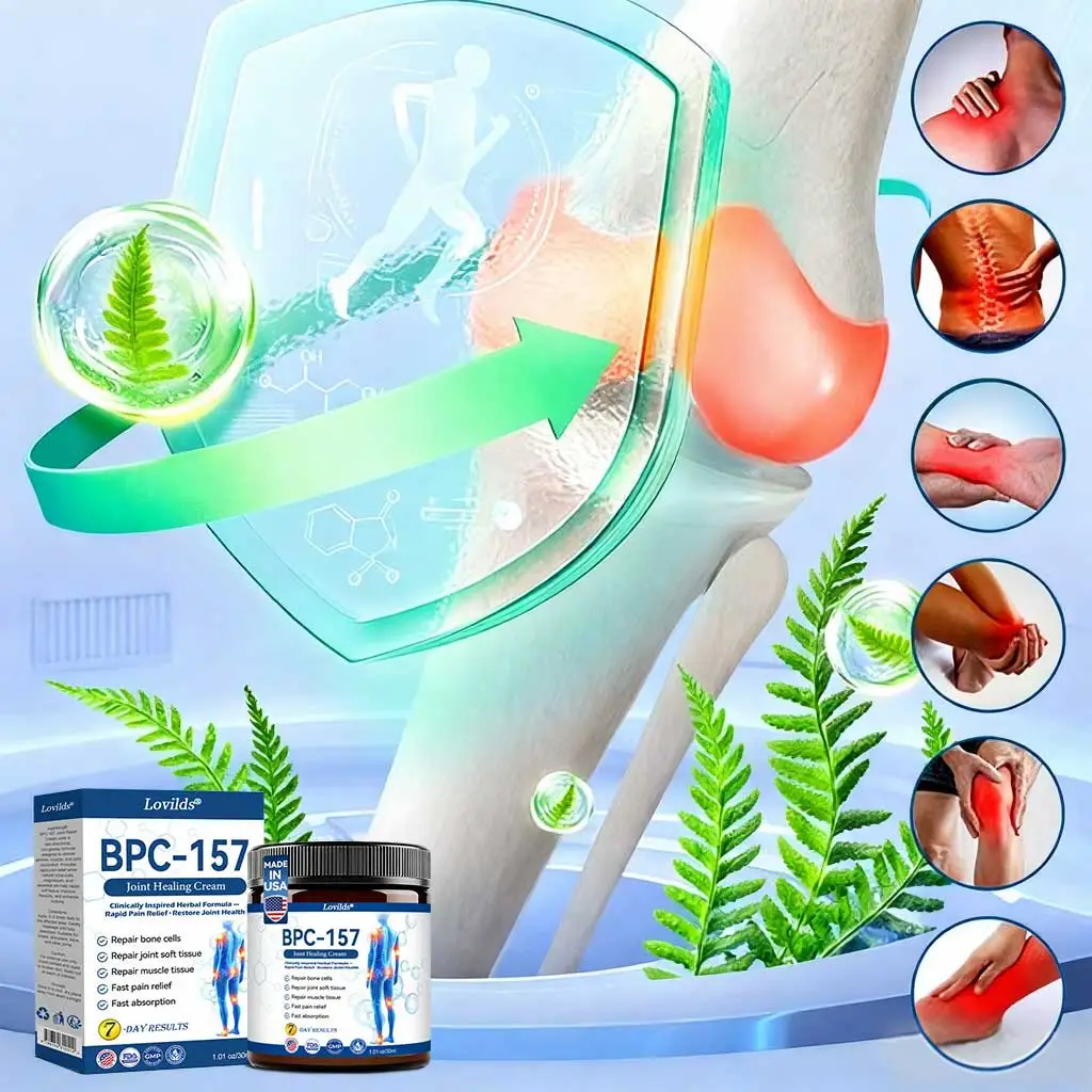 Lovildsยฎ BPC-157 Joint Healing Cream Developed through five years of research and experimentation by more than 30 international experts in orthopedics. rheumatology. immunology. and neuroregeneration. this formula combines the core ingredient BPC-157 bioactive peptide with natural botanical extracts. It is designed to provide scientific support for arthritis. rheumatic disorders. neuropathic conditions. and sports-related injuries.This product has undergone FDA certification as well as safety and efficacy testing. representing a scientifically validated approach for pain relief. soft tissue repair. and comprehensive joint health management.
