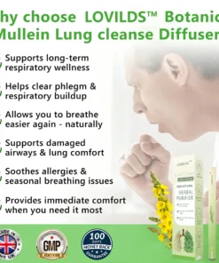 Customer studies show LOVILDSโข Botanical Mullein Lung Cleanse Diffuserย delivers powerful lung-supporting effects, especially for those exposed to smoking, industrial dust, and pollution. Users reportedย dramatic improvement in persistent coughing, shortness of breath, phlegm, and chest tightness.
