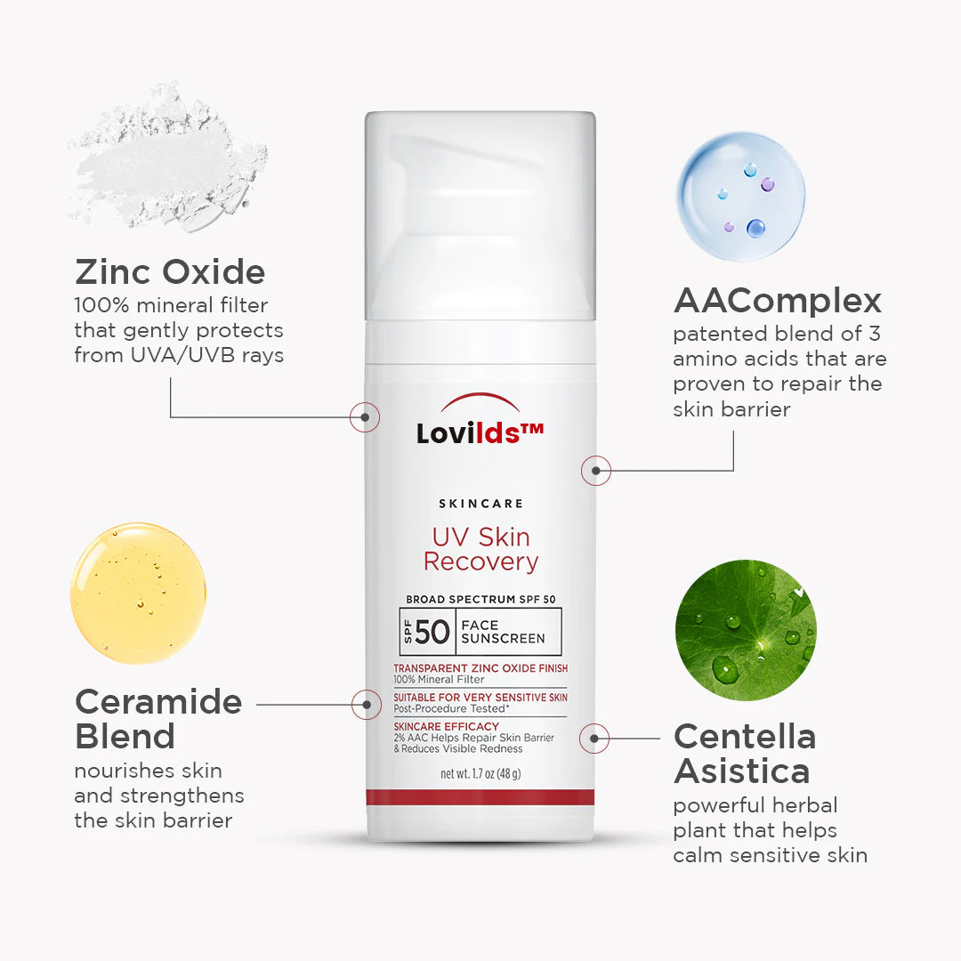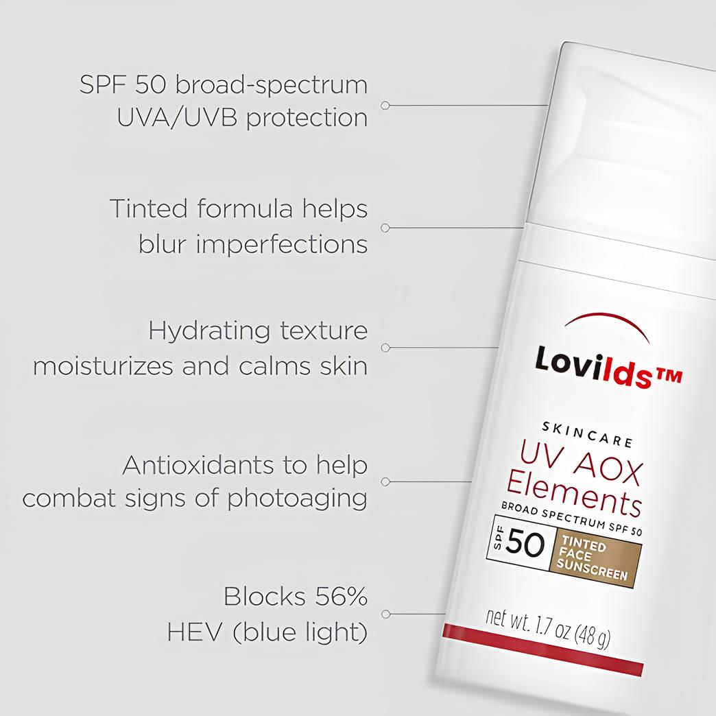 LOVILDS™ UV AOX Elements Tinted Mineral Sunscreen is a dermatologist-recommended SPF 50 facial sunscreen that provides broad-spectrum UVA/UVB protection while nourishing your skin. This 100% mineral-based formula is enriched with powerful antioxidants to combat environmental stressors, smooth fine lines, and keep your skin hydrated throughout the day.