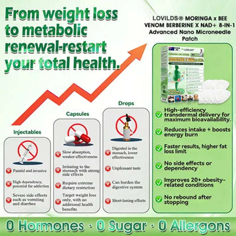 We are a top-tier endocrinology research team., and many of us have personally experienced obesity and its associated complications. Over the years, we have also evaluated commonly available weight-loss interventions on the market, including injectable therapies, capsules, and Oral weight-loss pills. However, their outcomes were often limited, and many were accompanied by tolerability concerns. These experiences motivated us to develop a safer, more natural, and more effective approach to metabolic health and weight management. After more than 12 years of research, our team initiated self-testing of this program, successfully overcoming the limitations of traditional single-pathway interventions that frequently cause gastrointestinal side effects. By adopting a dual-pathway strategy—supporting appetite regulation and fat metabolism while also addressing post-weight-loss skin firmness—we observed significant improvements in body weight and metabolic health, without rebound weight gain or adverse reactions. Subsequently, we conducted large-scale studies and clinical trials involving more than 5,000 participants, further validating the performance of 𝐋𝐎𝐕𝐈𝐋𝐃𝐒® 𝐌𝐨𝐫𝐢𝐧𝐠𝐚 · 𝐁𝐞𝐞 𝐯𝐞𝐧𝐨𝐦 · 𝐁𝐞𝐫𝐛𝐞𝐫𝐢𝐧𝐞 × 𝐍𝐀𝐃+ 𝟖-𝐢𝐧-𝟏 𝐀𝐝𝐯𝐚𝐧𝐜𝐞𝐝 𝐍𝐚𝐧𝐨 𝐌𝐢𝐜𝐫𝐨𝐧𝐞𝐞𝐝𝐥𝐞 𝐏𝐚𝐭𝐜𝐡 in metabolic regulation, appetite control, and overall health outcomes. These benefits were particularly pronounced among overweight or obese adults over the age of 40. Supported by contemporary medical research, 𝐋𝐎𝐕𝐈𝐋𝐃𝐒® 𝐌𝐨𝐫𝐢𝐧𝐠𝐚 · 𝐁𝐞𝐞 𝐯𝐞𝐧𝐨𝐦 · 𝐁𝐞𝐫𝐛𝐞𝐫𝐢𝐧𝐞 × 𝐍𝐀𝐃+ 𝟖-𝐢𝐧-𝟏 𝐀𝐝𝐯𝐚𝐧𝐜𝐞𝐝 𝐍𝐚𝐧𝐨 𝐌𝐢𝐜𝐫𝐨𝐧𝐞𝐞𝐝𝐥𝐞 𝐏𝐚𝐭𝐜𝐡 has undergone rigorous FDA regulatory review and evaluation, with its safety, effectiveness, and compliance formally recognized. This formulation represents a scientific advancement beyond conventional weight-loss products that are often associated with significant gastrointestinal burden, offering a natural, safe, and effective option for individuals seeking comprehensive metabolic support and sustainable long-term weight management.”